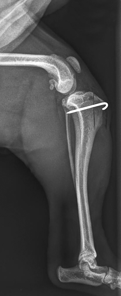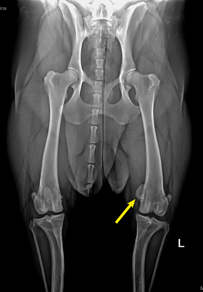 Bei großen Rassen, mit X-beiniger Stellung der Hinterbeine, kommt eine Luxation der Kniescheibe nach außen (lateral) vor.